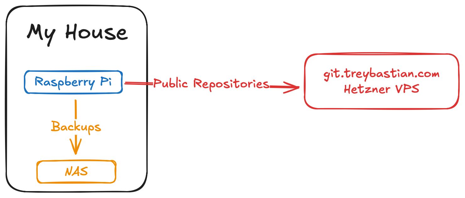 All of my repos live on my laptop, my PC, the pi and backed up to 2 MIRRORED 6TB hard drives in my NAS. If EVERY one of those fails at the same time, I feel like I deserved it. All of my public repos are further mirrored on a VPS running a Tangled Knot.